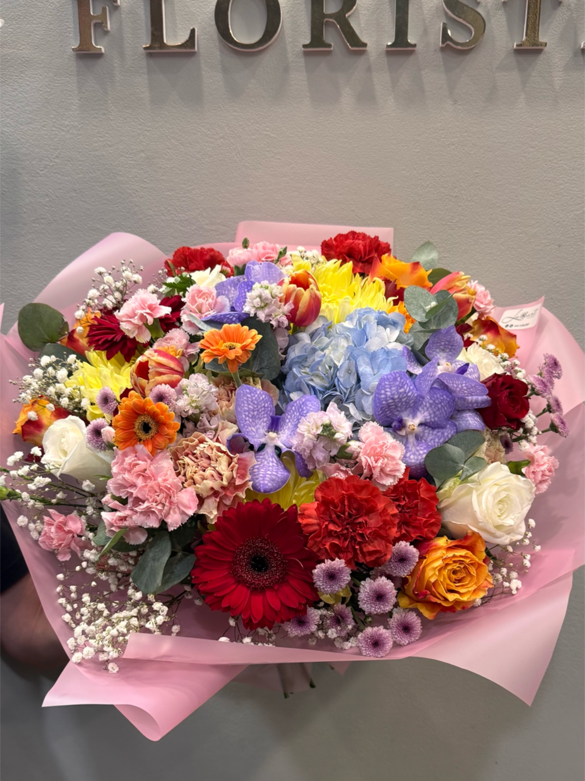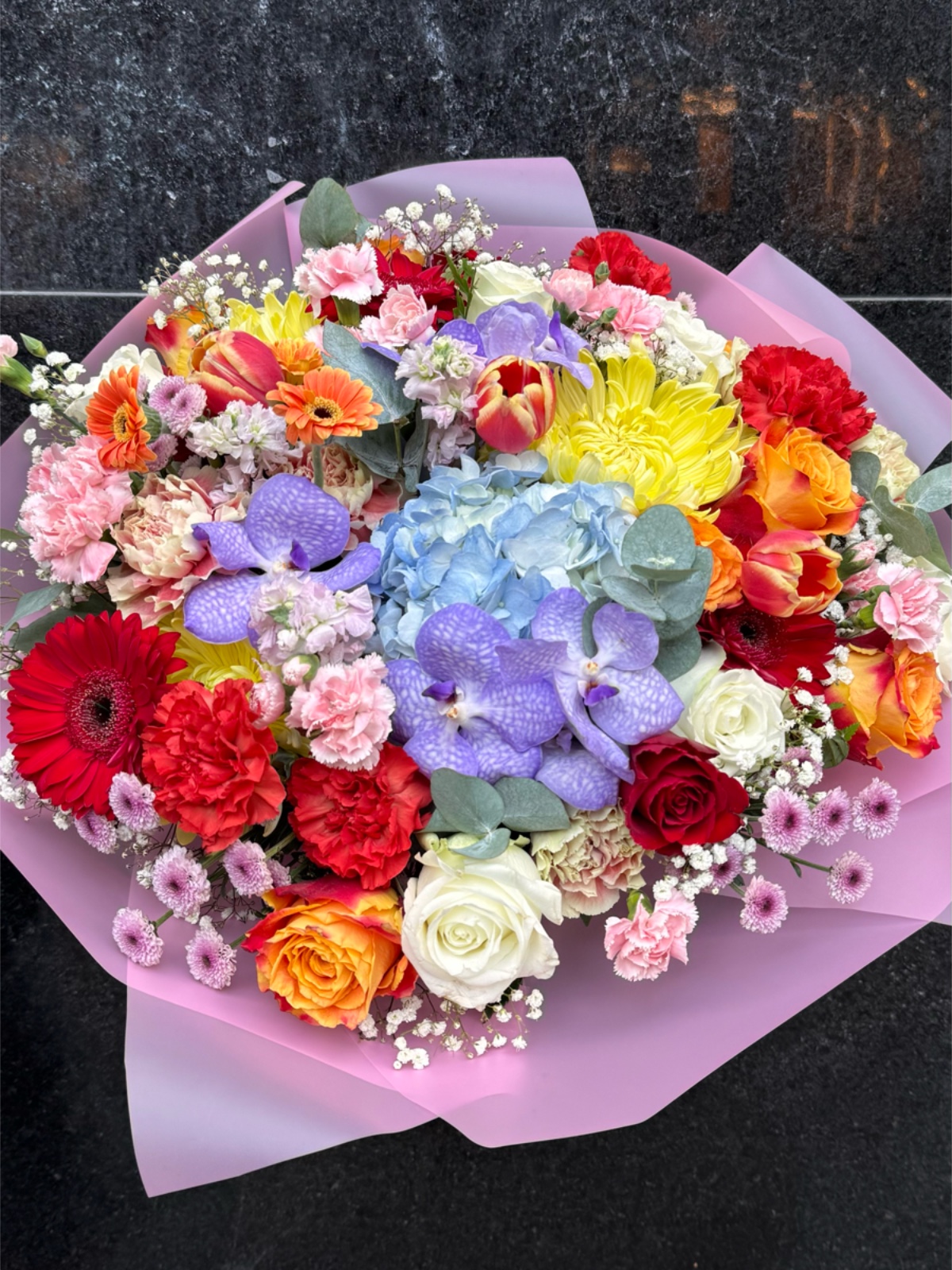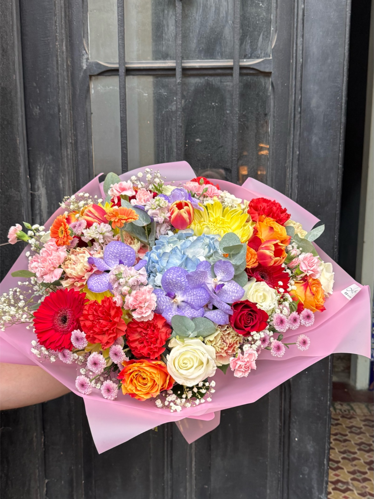 Este ramo reúne flores frescas en una explosión de colores que representan toda la gama del arcoíris. La composición es intensa, luminosa y llena de dinamismo visual. Ideal para transmitir optimismo, celebración y buen humor. Perfecto para cumpleaños, felicitaciones o momentos especiales llenos de energía positiva. Un ramo que destaca por su alegría y carácter expresivo.