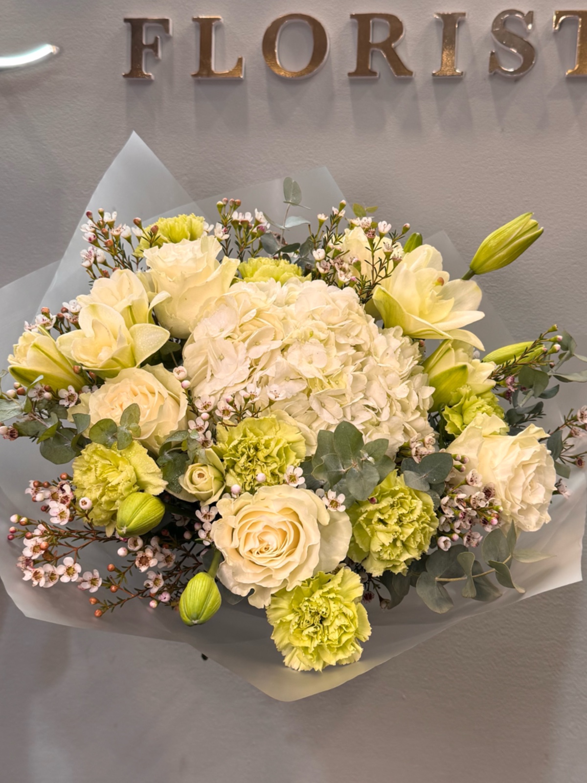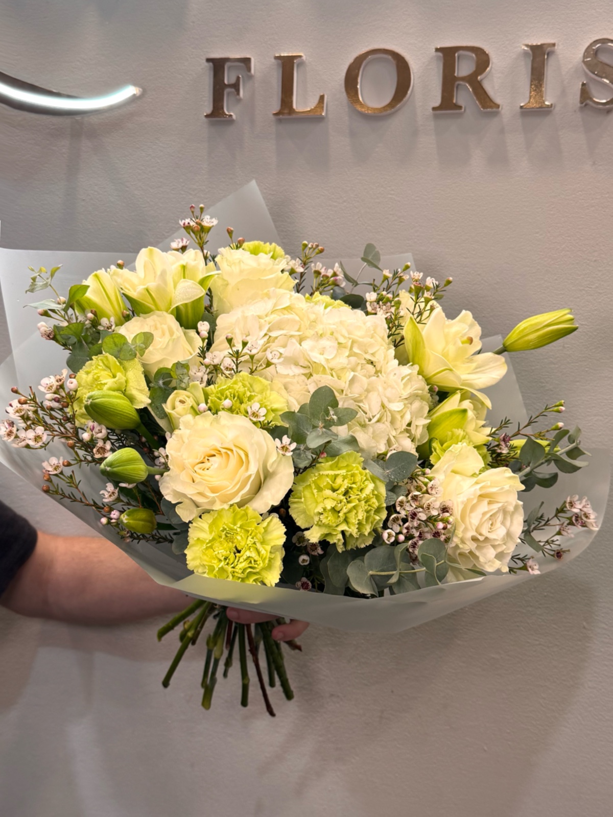 Este ramo combina lirios frescos con flores blancas y verdes suaves. Su diseño es equilibrado y sereno. Es ideal para regalos sofisticados y ocasiones especiales. Transmite pureza y tranquilidad. Una composición elegante y armoniosa.