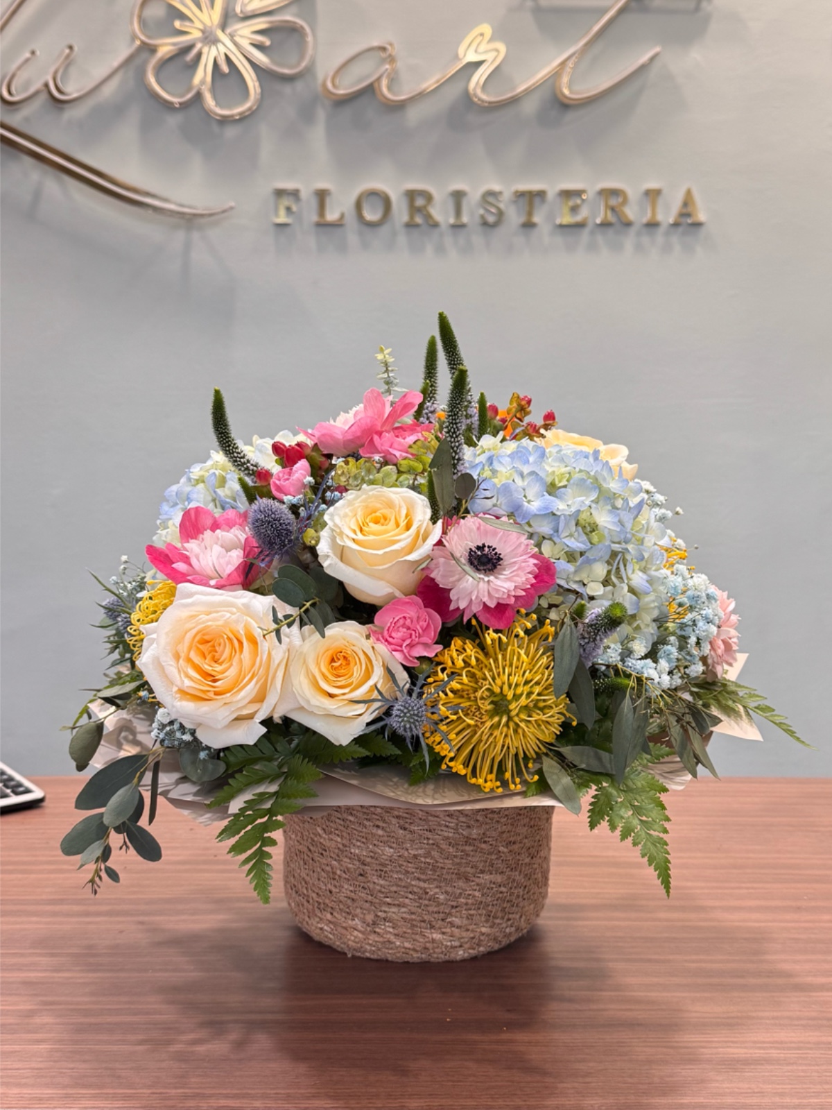 Esta composición floral en cesta está realizada sobre oasis. Incluye rosas crema, hortensia azul, anémonas rosadas y claveles. El diseño es espontáneo y equilibrado. Los materiales naturales refuerzan su estilo. Un regalo auténtico y fresco.