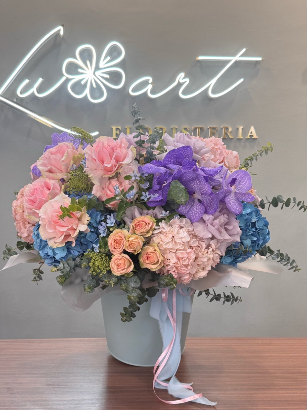 Arreglo floral en caja con base de oasis. Incluye hortensias azules y rosadas, rosas melocotón y orquídeas violetas. El verde decorativo completa la composición. El estilo es exótico y sofisticado. Un regalo original y expresivo.