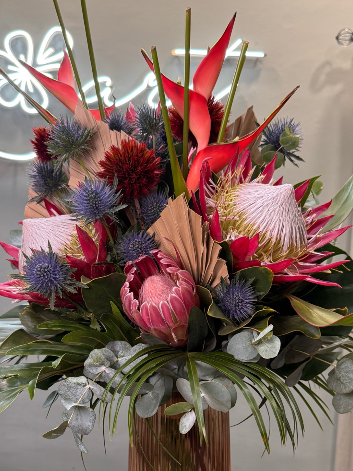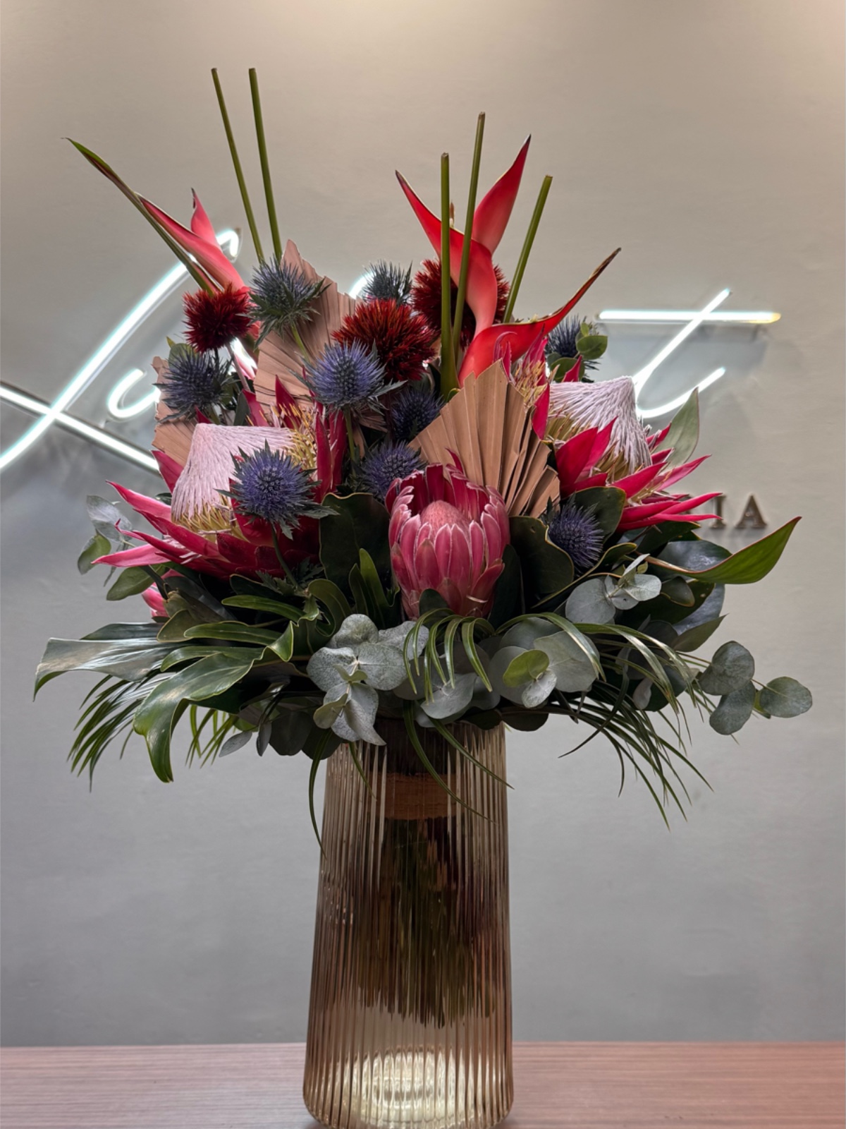 Este ramo exótico combina flores llamativas como proteas, eryngium y heliconias. Su estilo tropical se caracteriza por colores насыщados y formas poco convencionales. La composición es expresiva, audaz y visualmente impactante. Ideal para quienes buscan un ramo diferente y fuera de lo clásico. Un diseño floral que transmite exotismo, fuerza y originalidad.