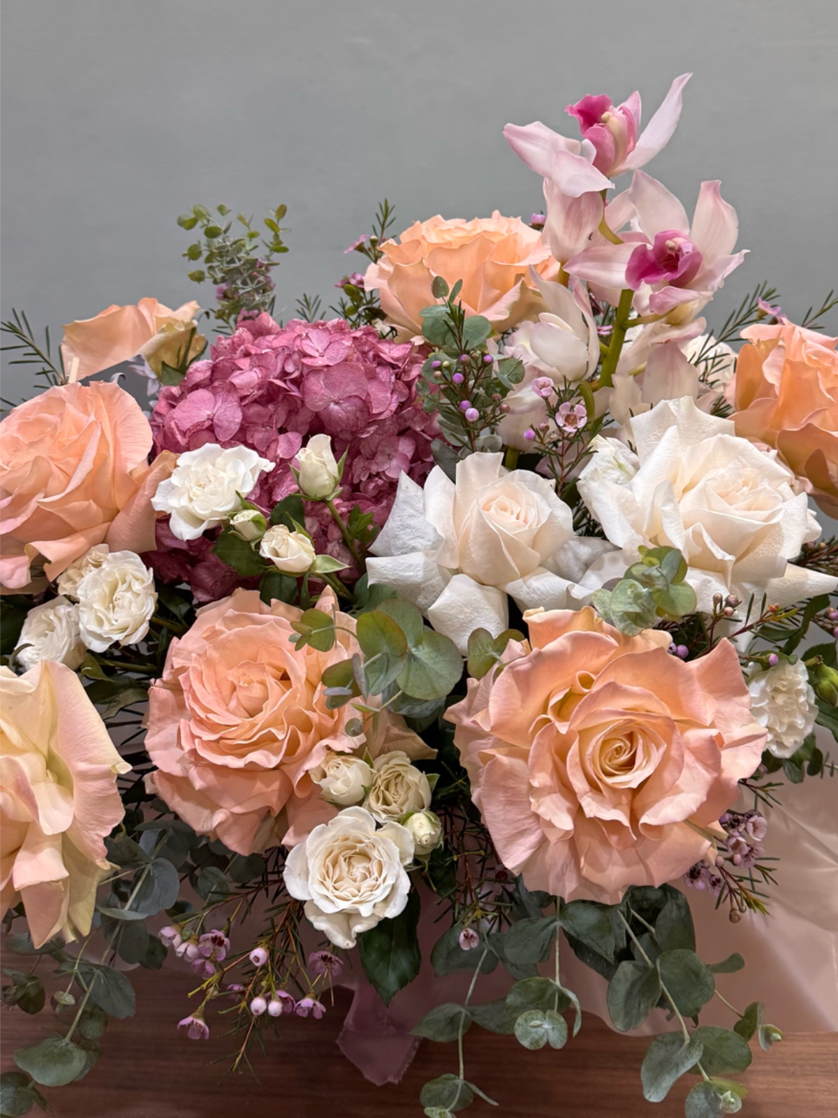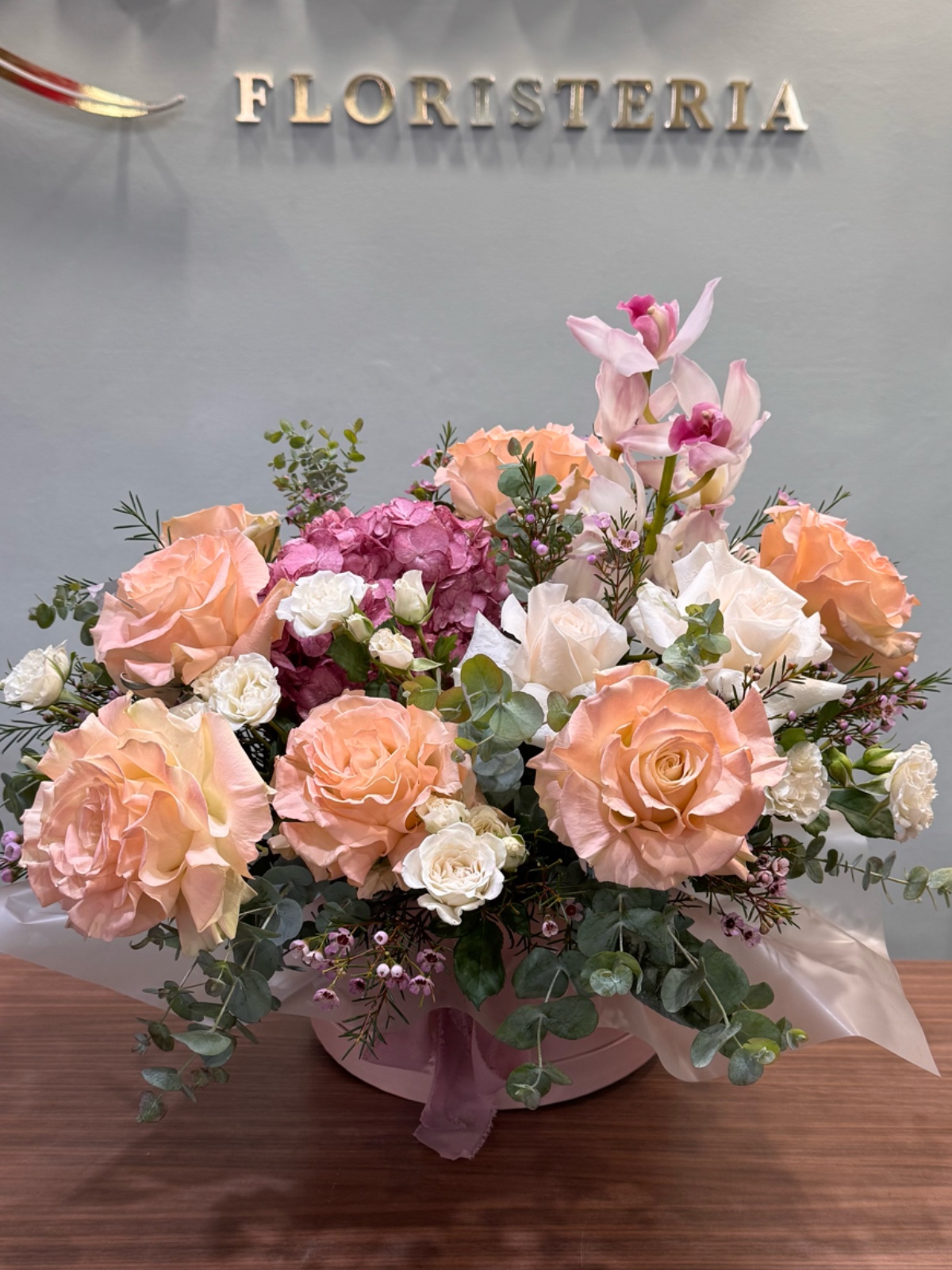 Esta composición floral en caja redonda está elaborada sobre oasis. Incluye rosas melocotón y crema, pequeñas flores blancas, eucalipto y orquídeas. El conjunto es cálido y elegante. La orquídea aporta un acento sofisticado. Ideal para un regalo especial y distinguido.