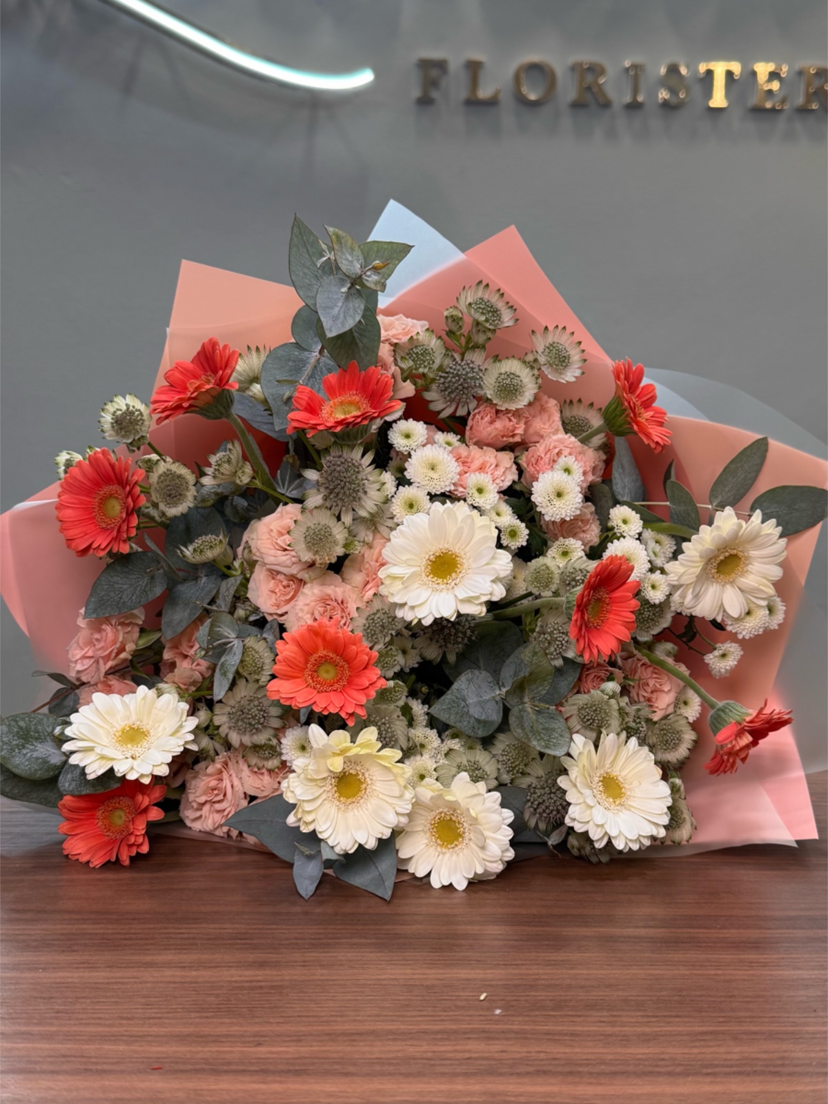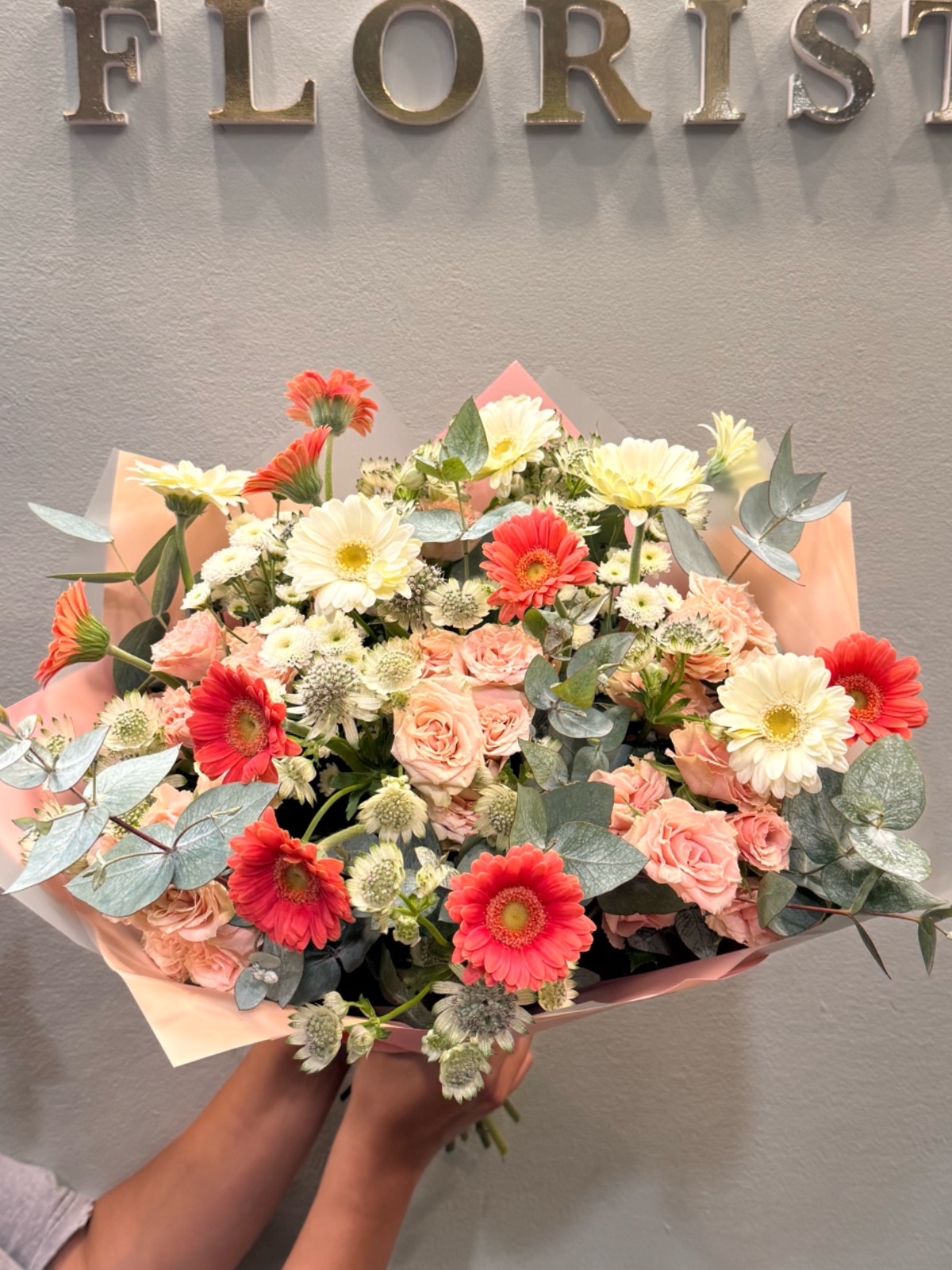 Este ramo combina flores frescas en suaves tonos melocotón, naranja y rosa. Su diseño es delicado, ligero y armonioso. Es ideal para regalos tiernos y luminosos. Transmite calidez, suavidad y alegría. Una composición equilibrada y femenina.