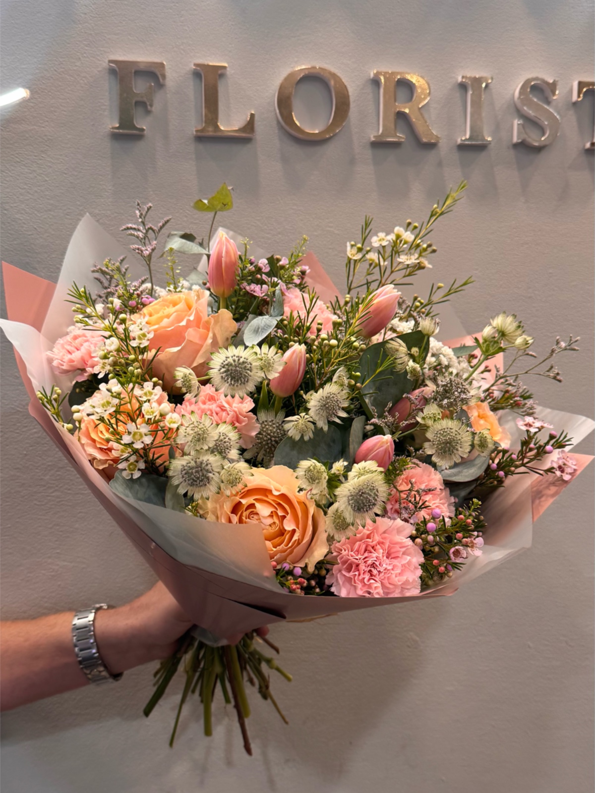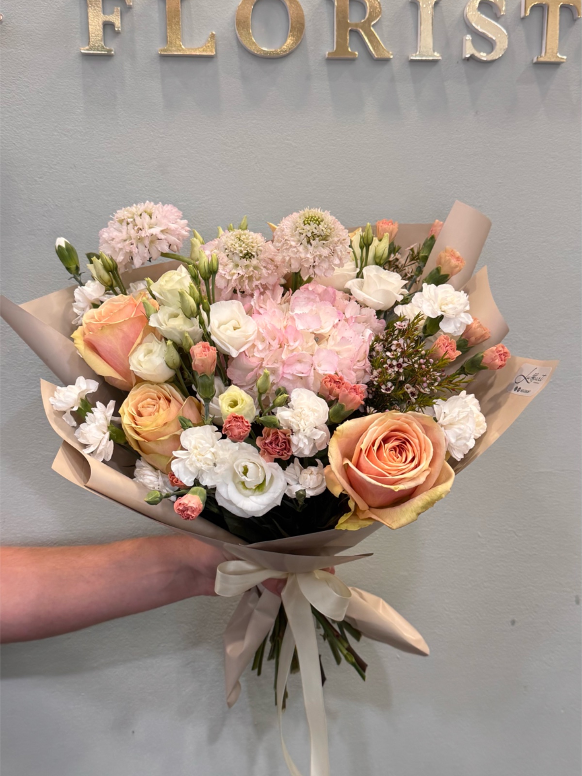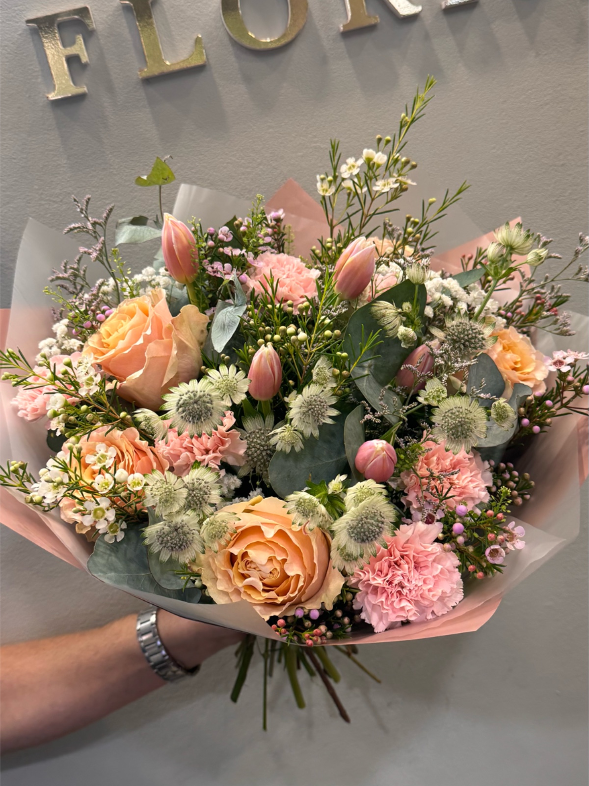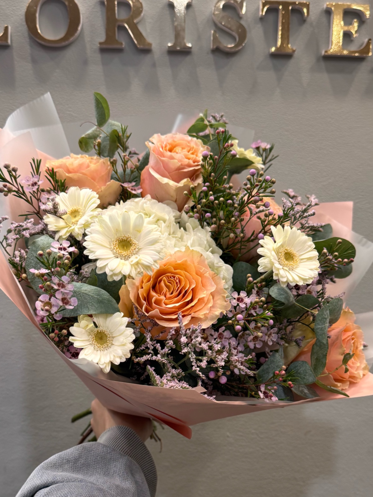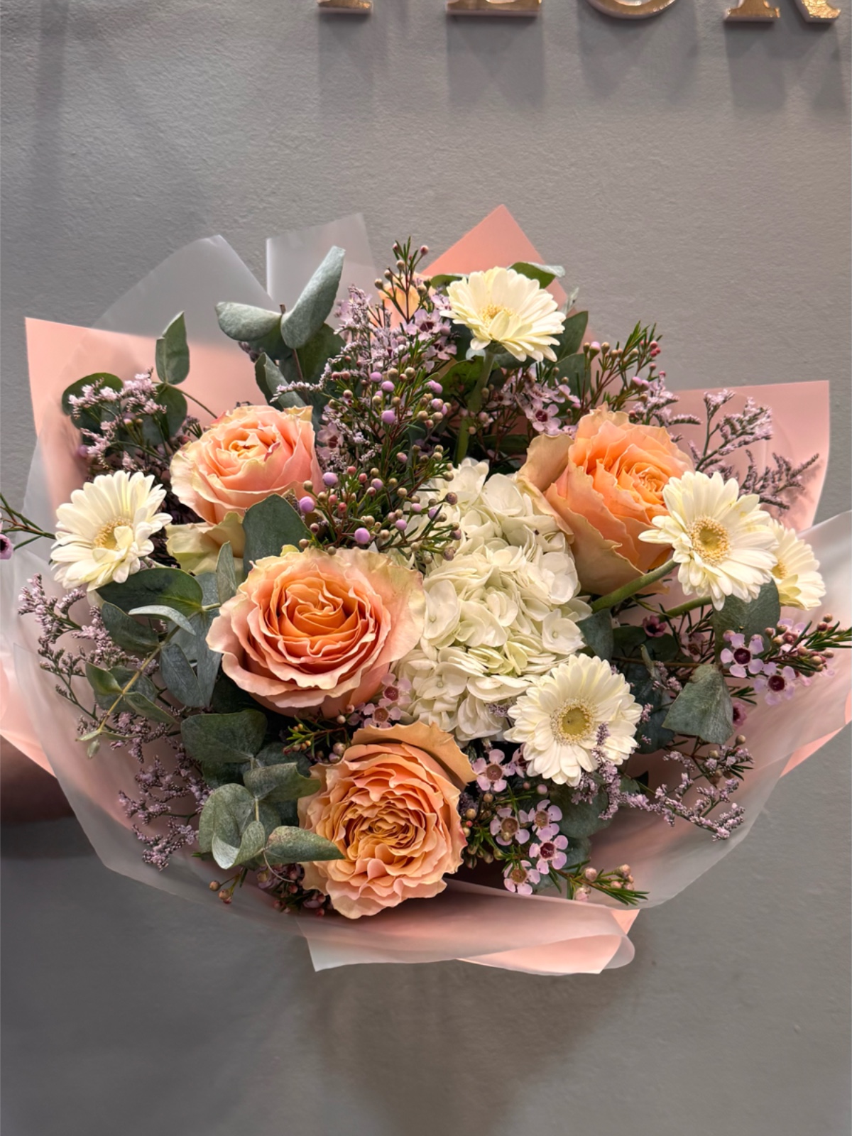 Este ramo reúne flores frescas de temporada en tonos melocotón. Su diseño es cálido y armonioso. Es ideal para regalos delicados y ocasiones especiales. Transmite suavidad y elegancia. Una composición equilibrada y refinada.