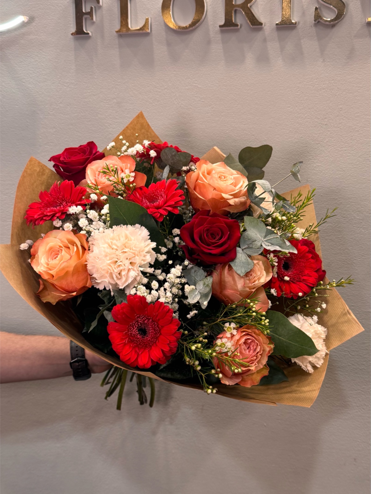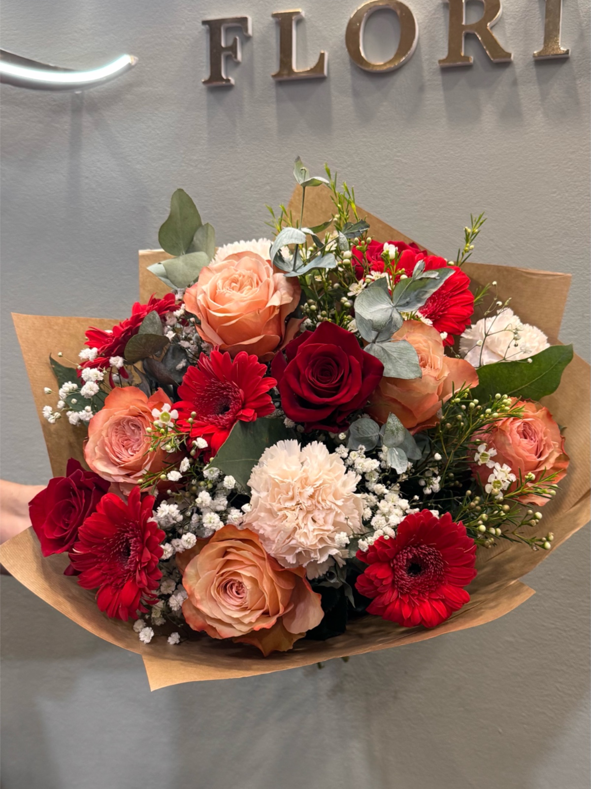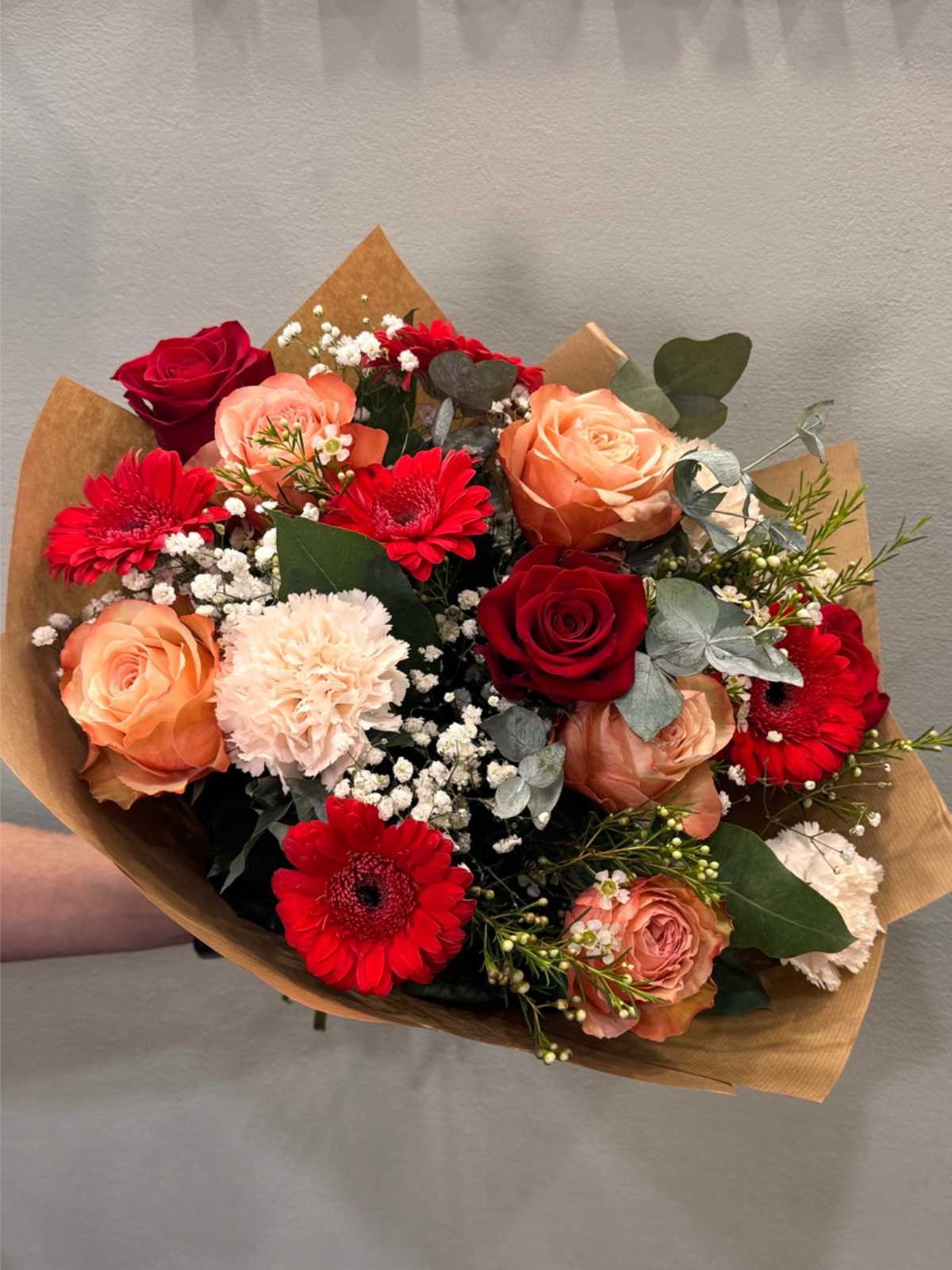 Este ramo combina flores rojas, naranjas y blancas en un diseño equilibrado y cálido. Su estilo natural transmite armonía y elegancia. Es ideal para regalos clásicos con un toque fresco y auténtico. Transmite vitalidad, alegría y naturalidad. Una composición elegante y acogedora.