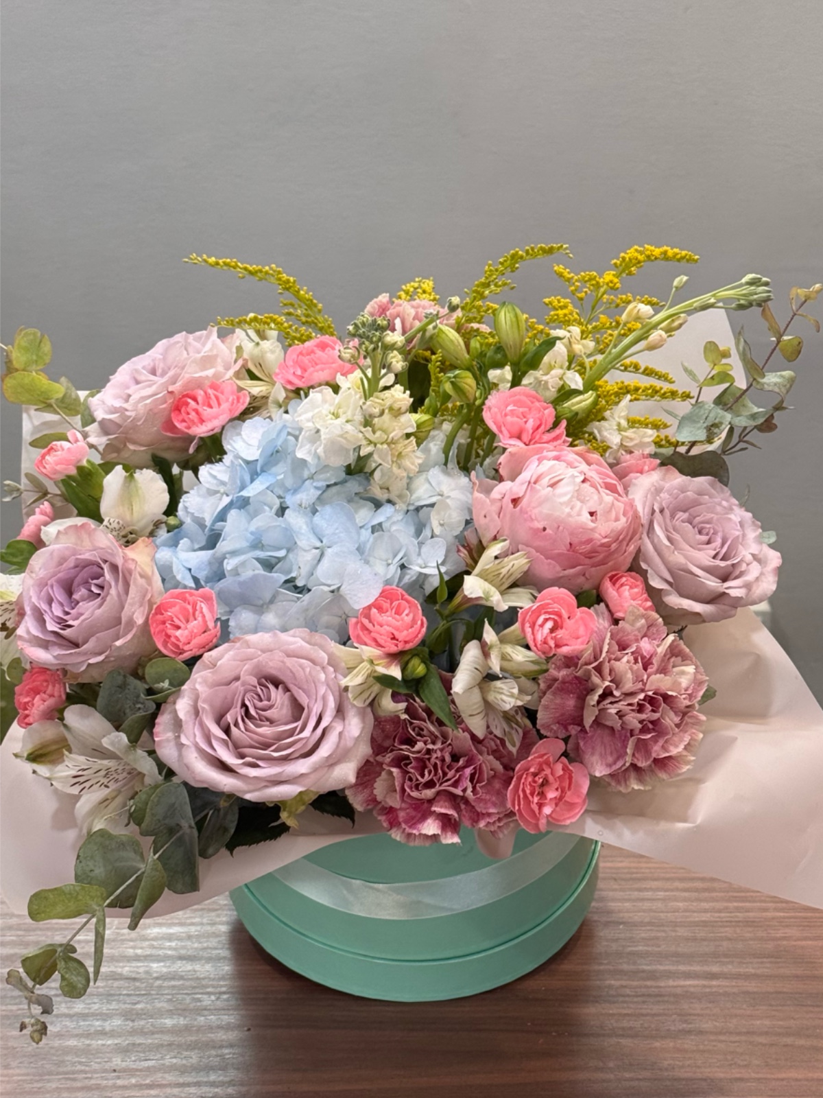 Arreglo floral en caja redonda color menta con base de oasis. Incluye rosas, hortensias, claveles y alstroemerias en tonos rosa, lila, azul claro y blanco. La mezcla de flores crea una composición suave y luminosa. El formato en caja no requiere jarrón. Ideal para regalar en cualquier ocasión especial.