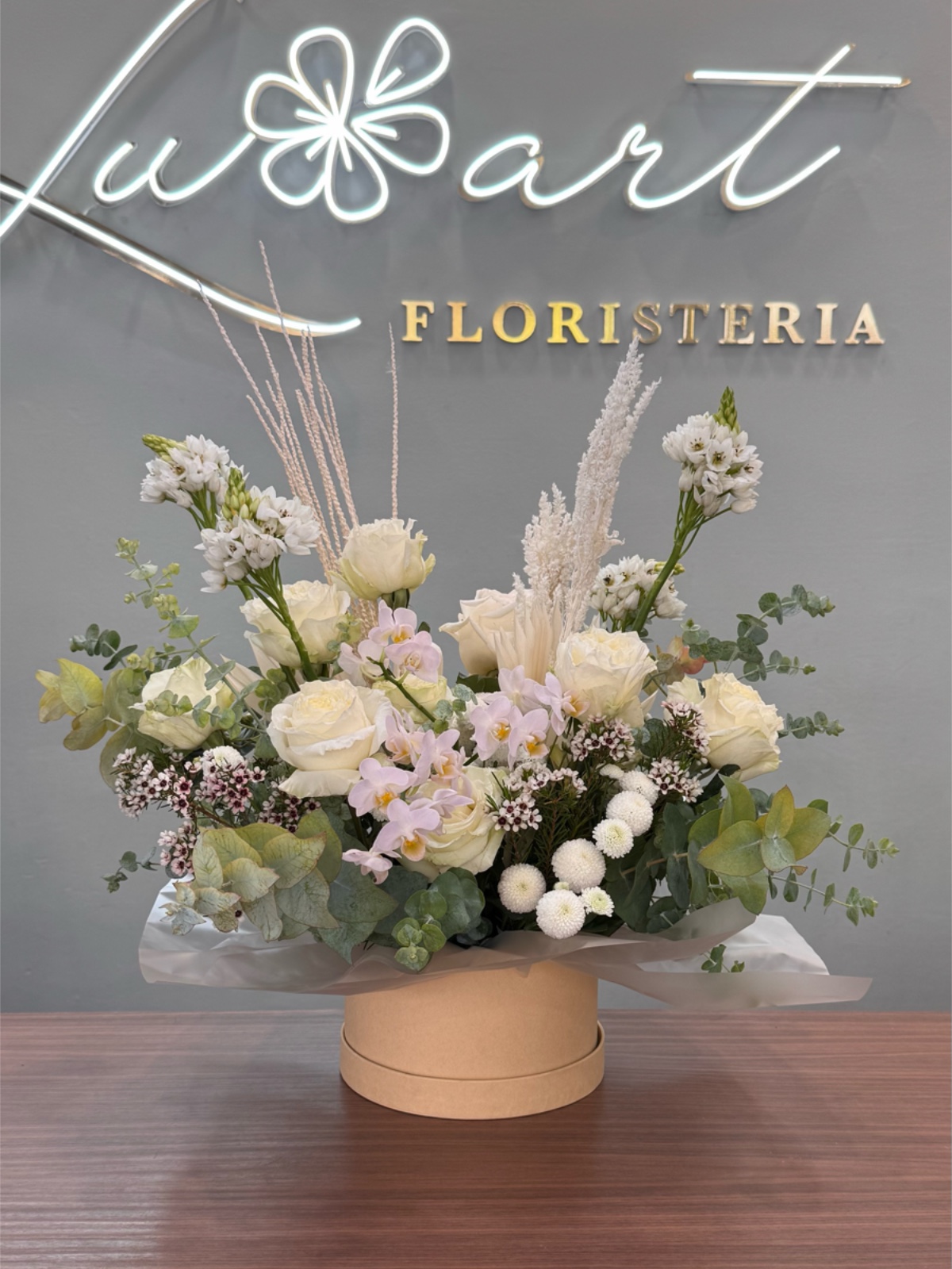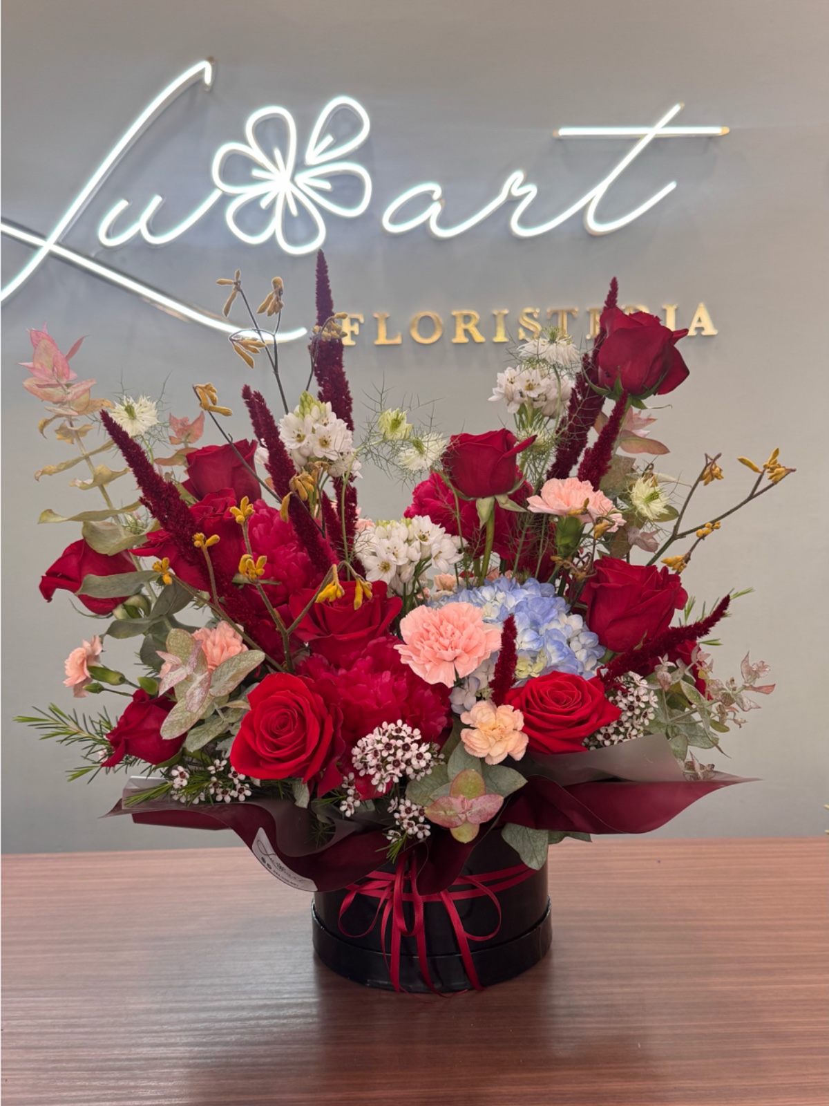 Composición floral artística en caja con flores frescas y secas.