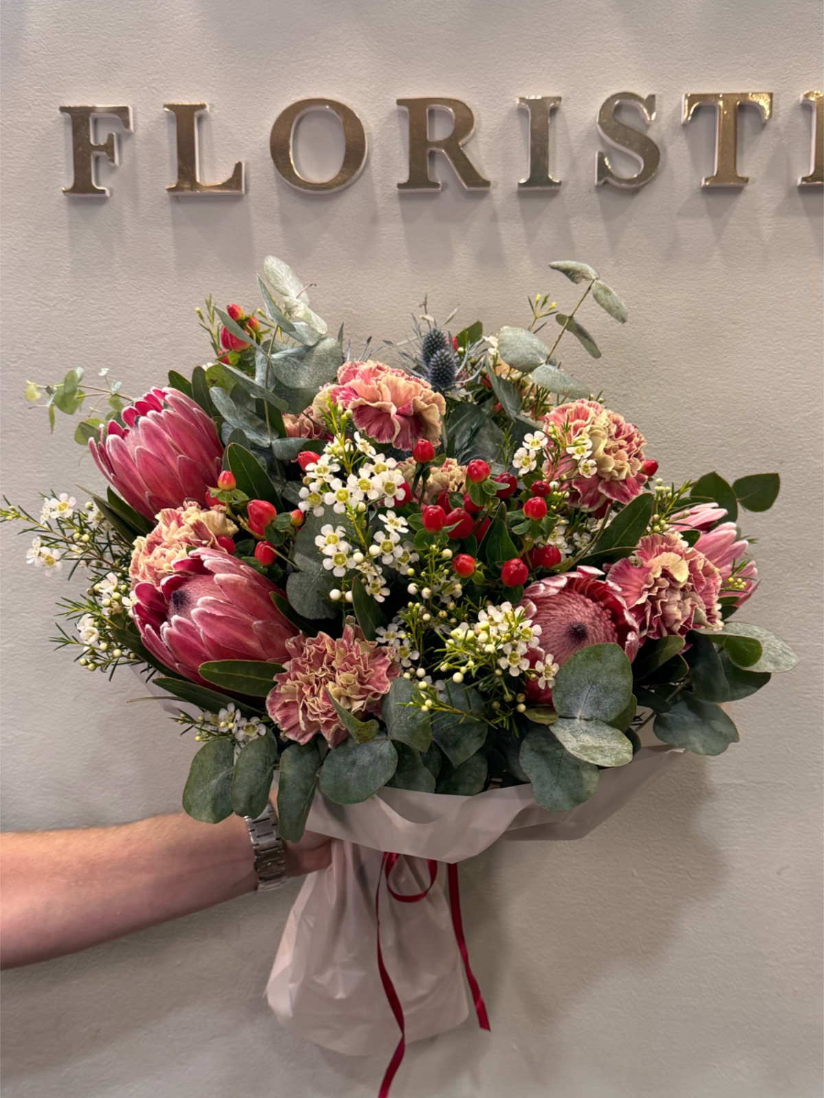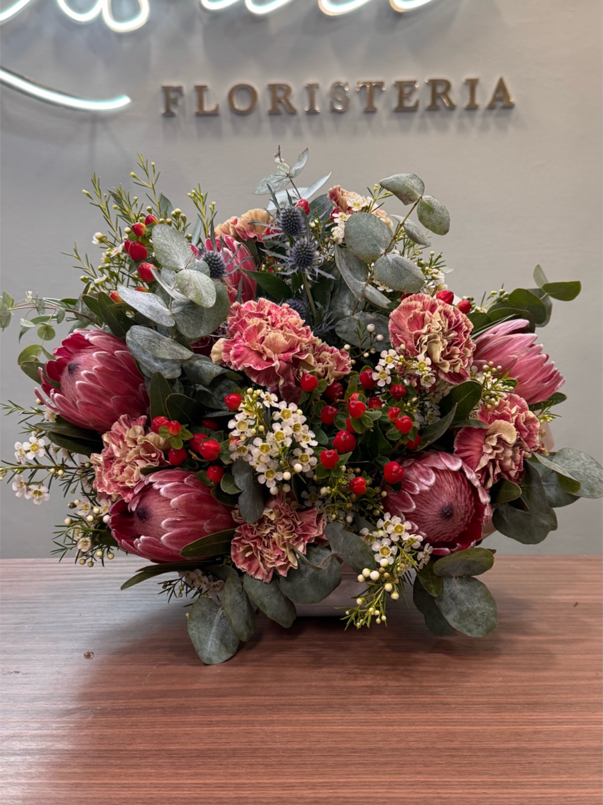 Este ramo de autor tiene como protagonista la protea, acompañada de flores en tonos rosa oscuro, rojo y blanco. La composición se completa con eucalipto, pequeñas flores blancas, bayas de hypericum y claveles, creando un equilibrio elegante y expresivo. Su estilo es sofisticado y poco convencional, pensado para destacar y sorprender. Ideal para personas que valoran diseños florales únicos y con carácter. Un ramo exclusivo que transmite fuerza, personalidad y creatividad floral.