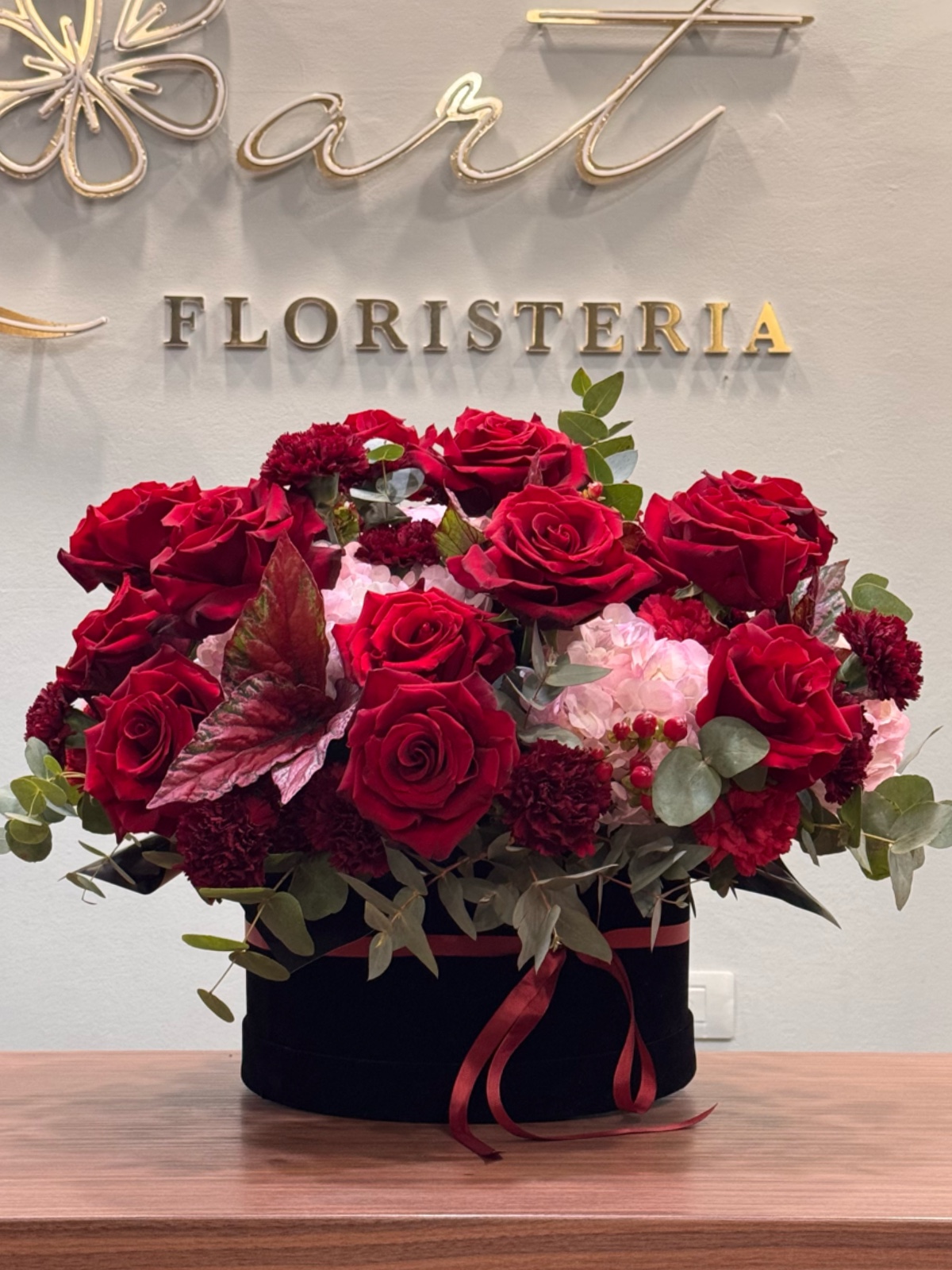 Esta composición floral se presenta en una caja de terciopelo negro con base de oasis. Incluye rosas rojas intensas, claveles y hortensias rosa claro. El verde decorativo aporta equilibrio. El conjunto transmite fuerza y elegancia. Perfecto para ocasiones especiales.