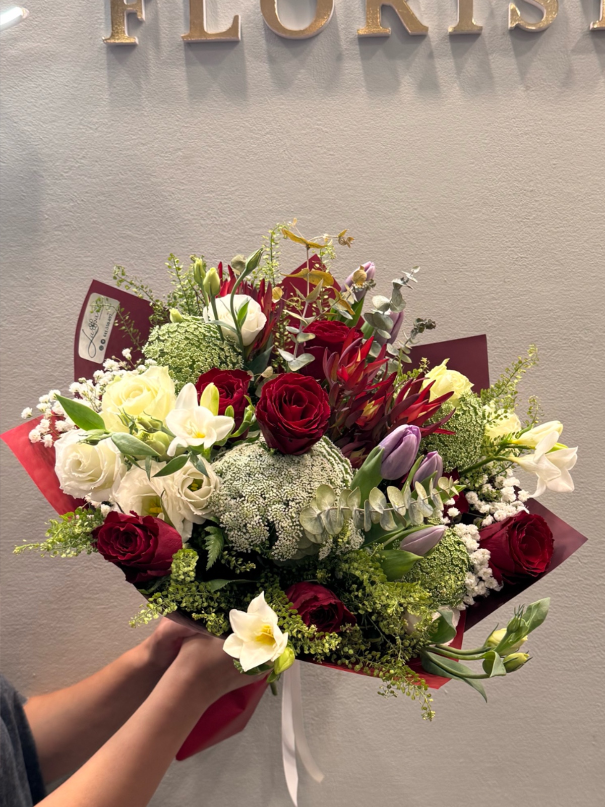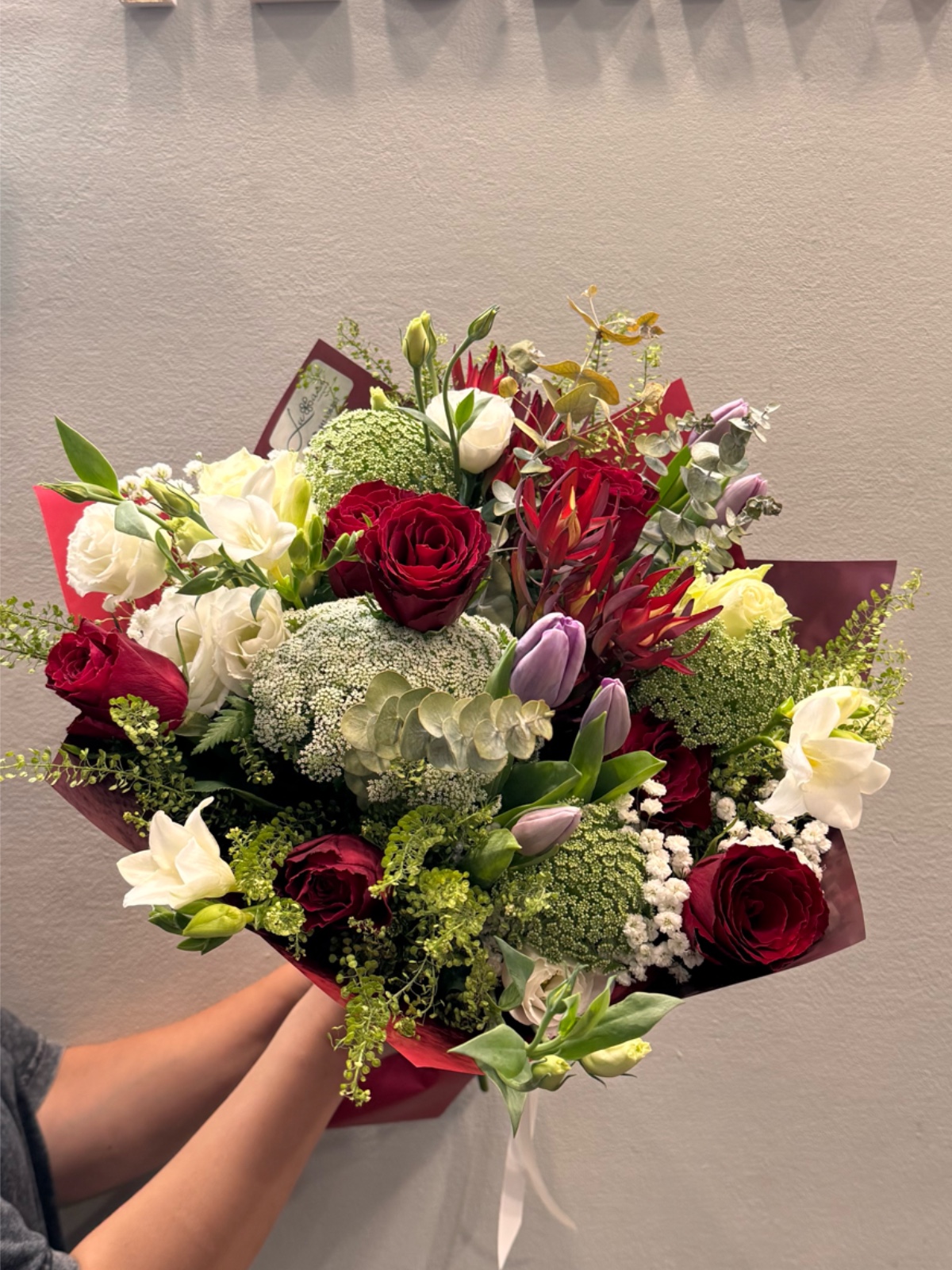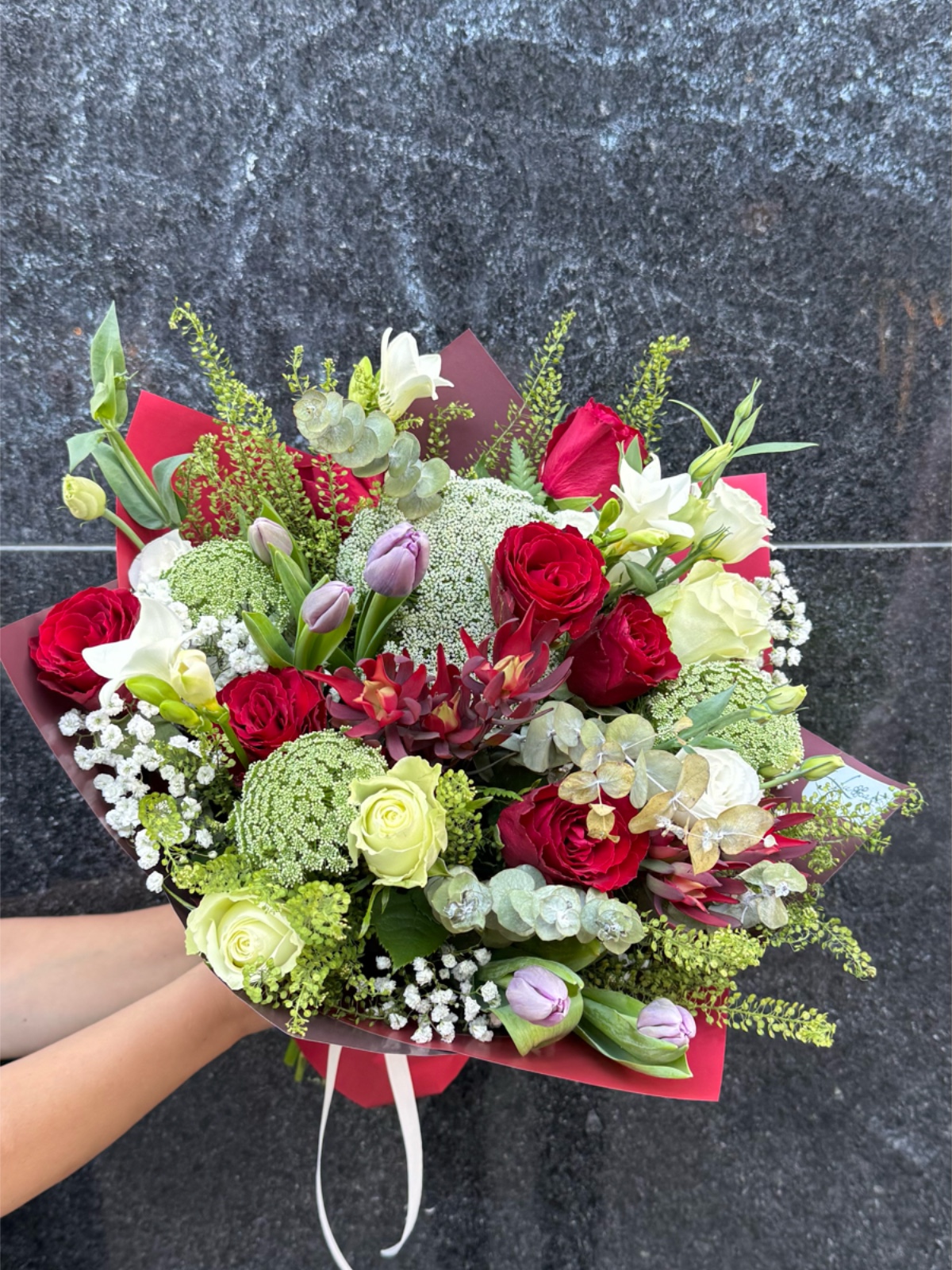 Este ramo combina tulipanes con flores rojas, verdes y blancas de temporada. Su diseño es fresco, armonioso y ligeramente moderno. Es ideal para regalos clásicos con un toque de creatividad. Transmite equilibrio, vitalidad y naturalidad. Una composición versátil y elegante.
