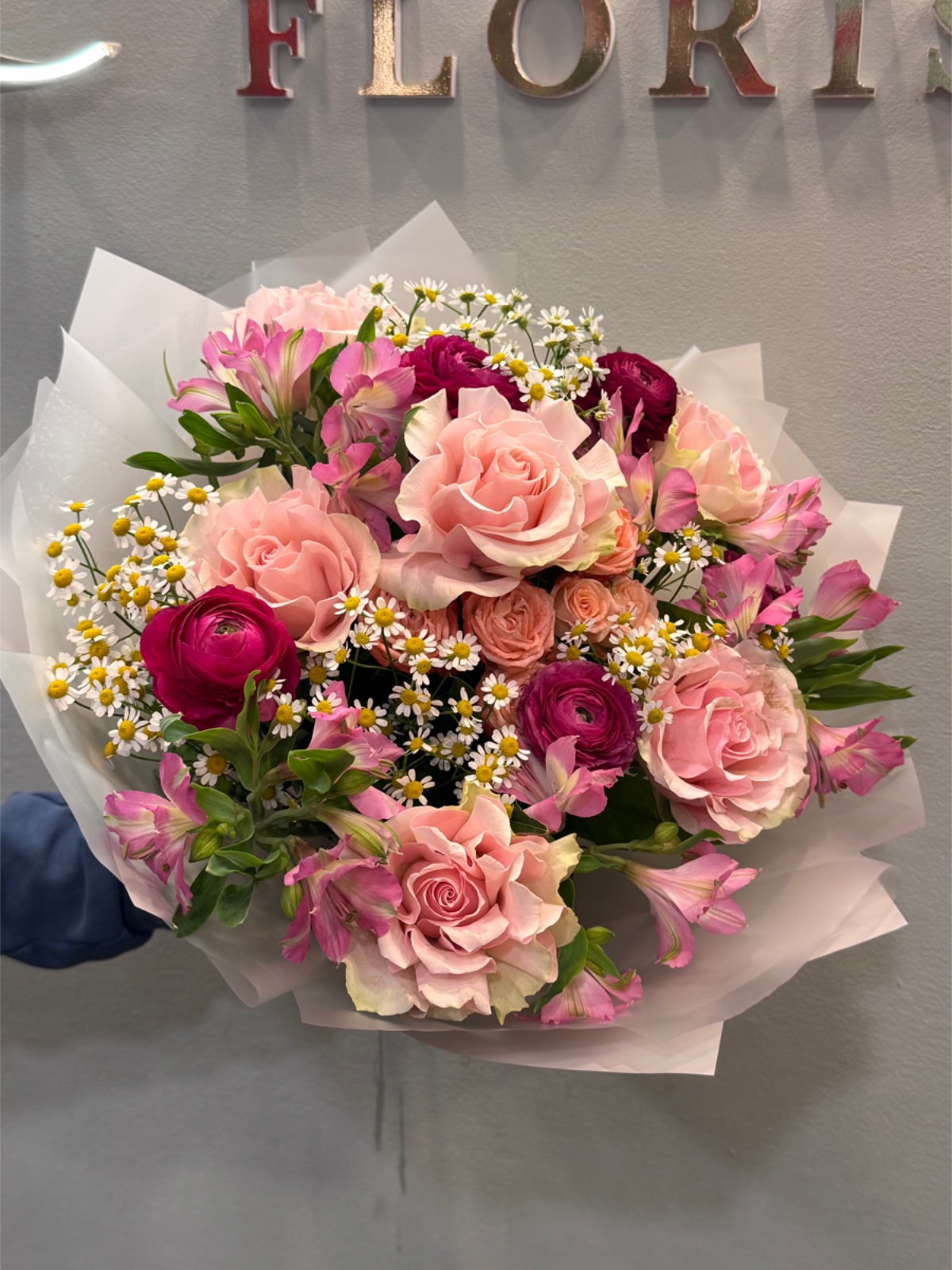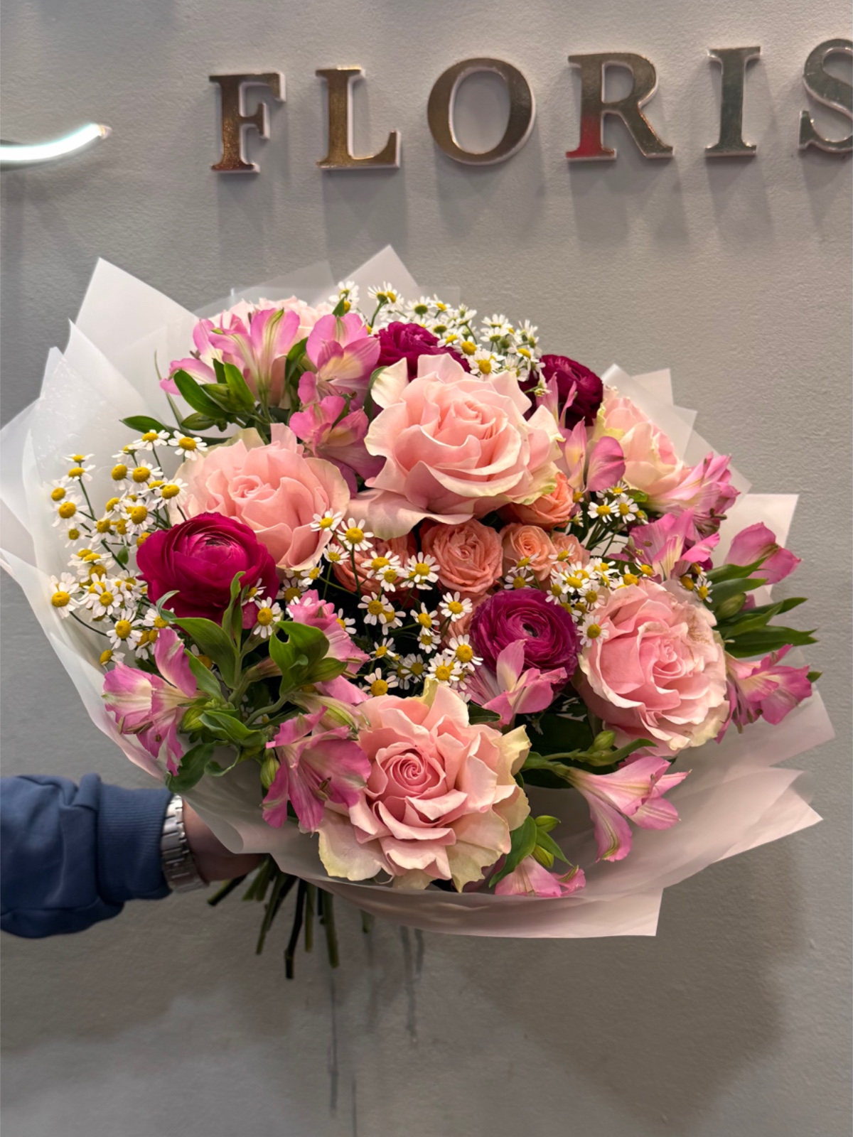Este ramo mezcla flores rosadas con margaritas delicadas. Su diseño es ligero y primaveral. Es ideal para regalos sutiles y llenos de ternura. Transmite frescura y dulzura. Una composición delicada y encantadora.