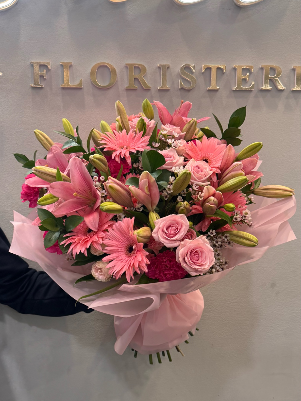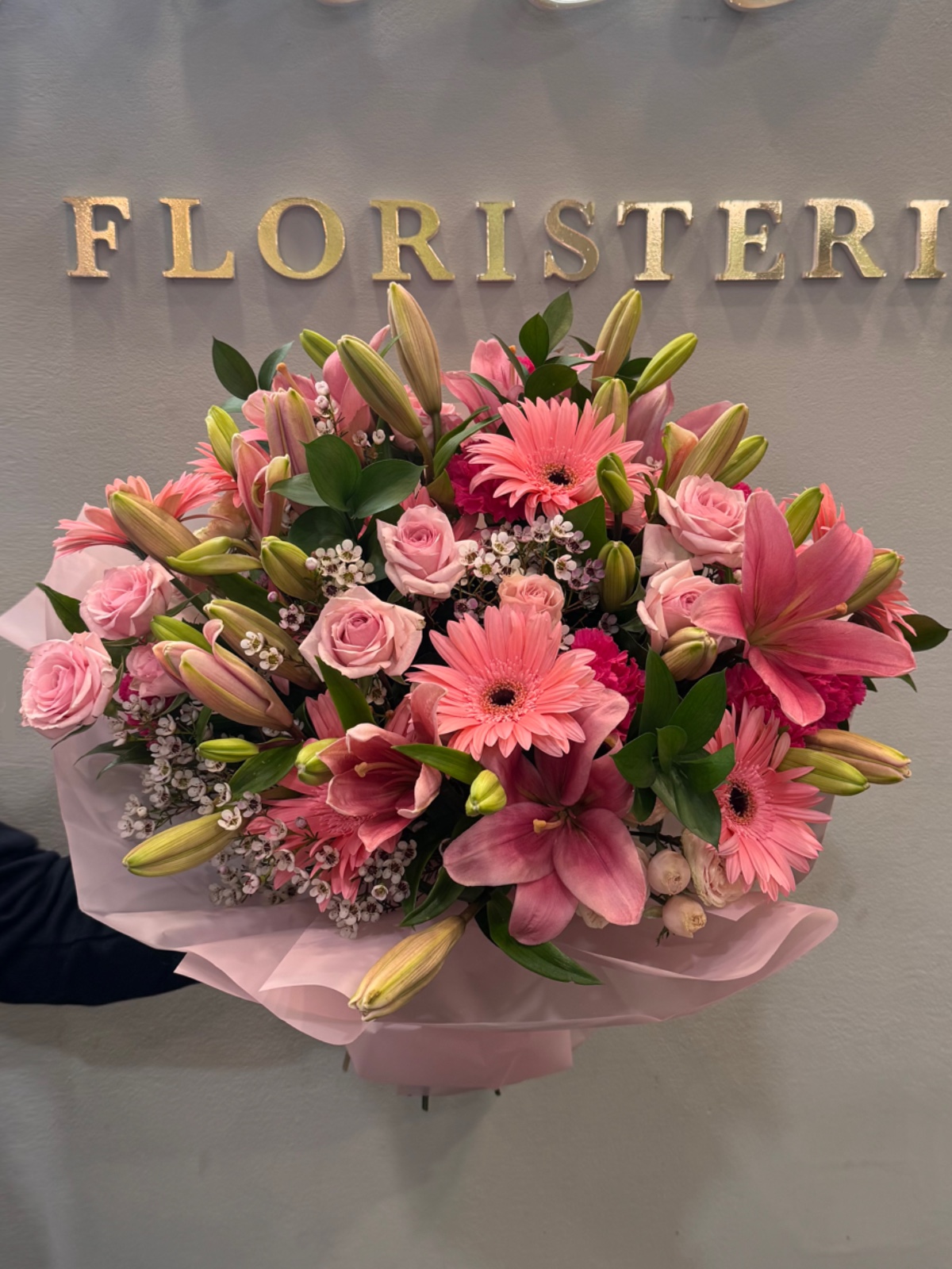 Este ramo combina rosas y lirios en tonos rosados con flores de temporada. Su diseño es delicado y armonioso. Es ideal para regalos elegantes y llenos de frescura. Transmite suavidad y equilibrio visual. Una composición refinada y ligera.
