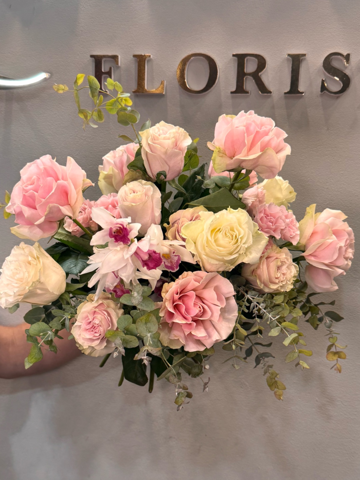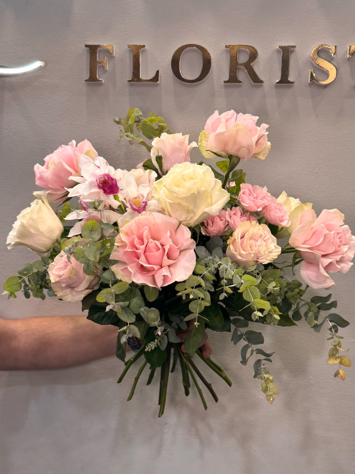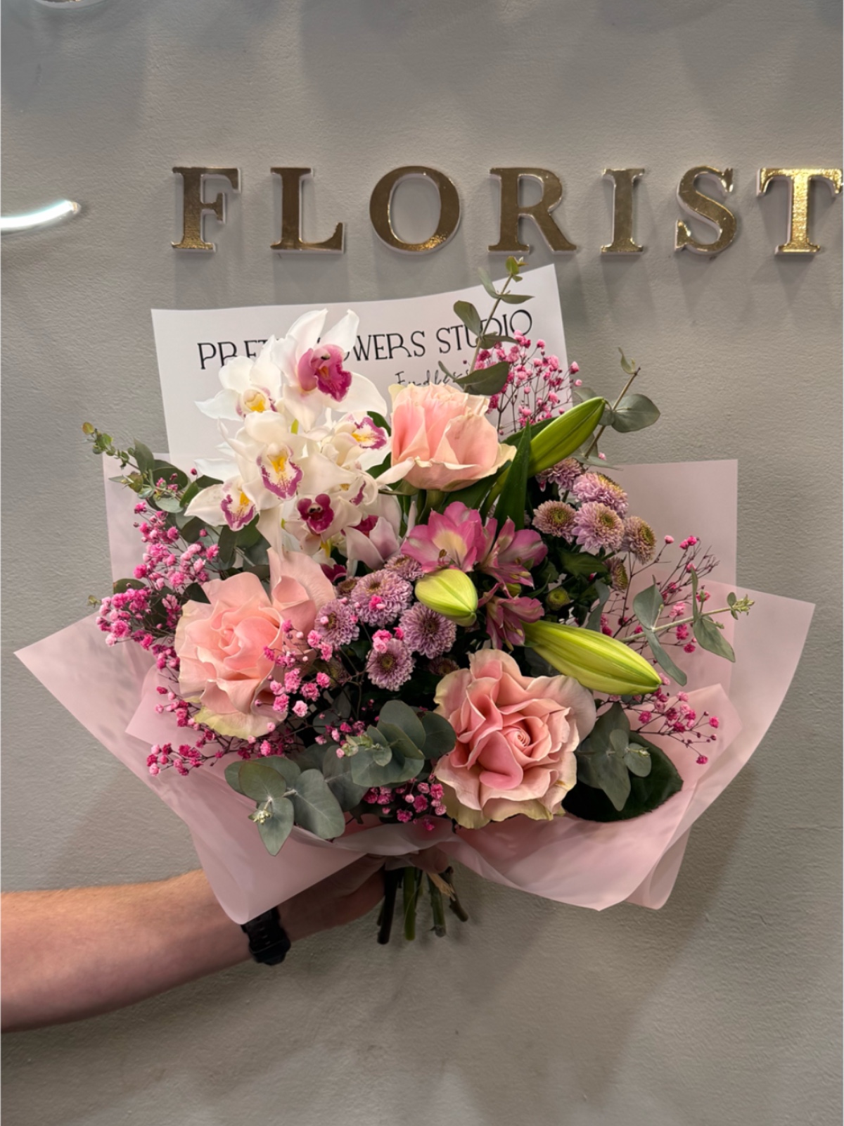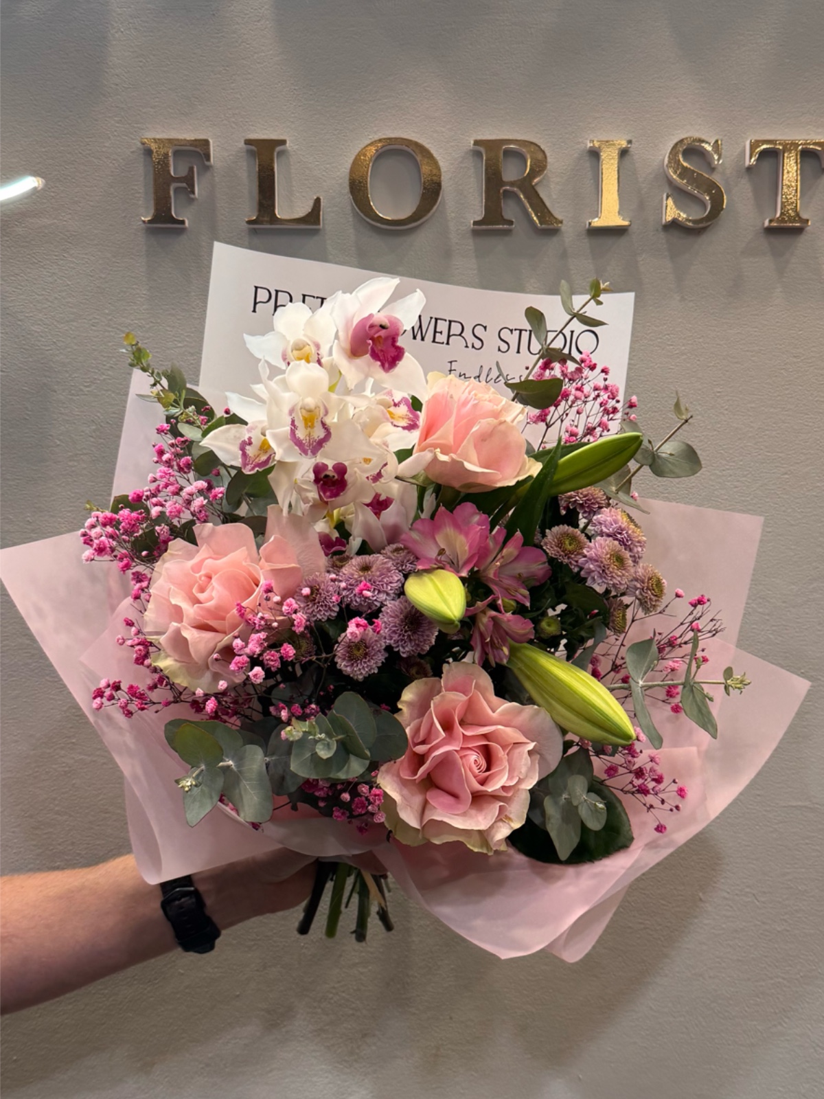 Este ramo combina una orquídea elegante con flores de temporada en tonos rosados. Su diseño es suave y refinado, con un carácter especial. Es ideal para regalos memorables y ocasiones importantes. Transmite elegancia, sensibilidad y distinción. Una composición equilibrada y sofisticada.