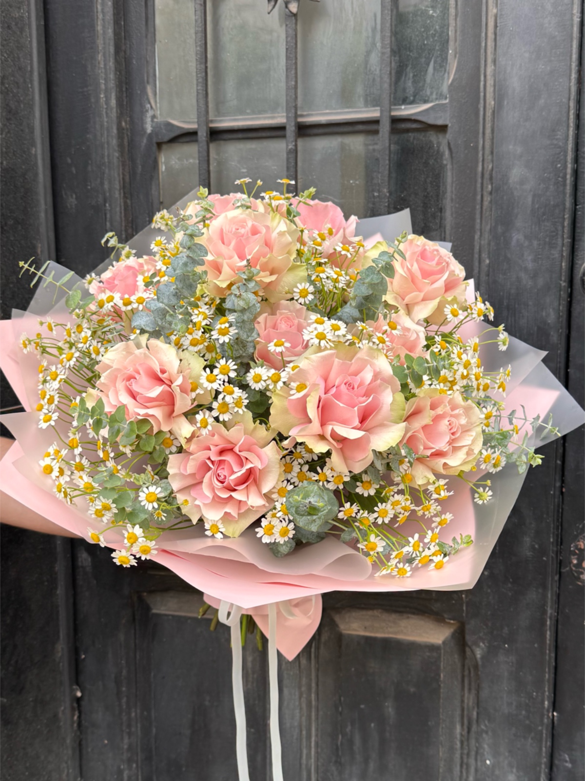 Este ramo combina rosas y margaritas con eucalipto fresco. Su diseño es suave y natural. Es ideal para regalos primaverales y gestos delicados. Transmite armonía y frescura. Una composición ligera y equilibrada.