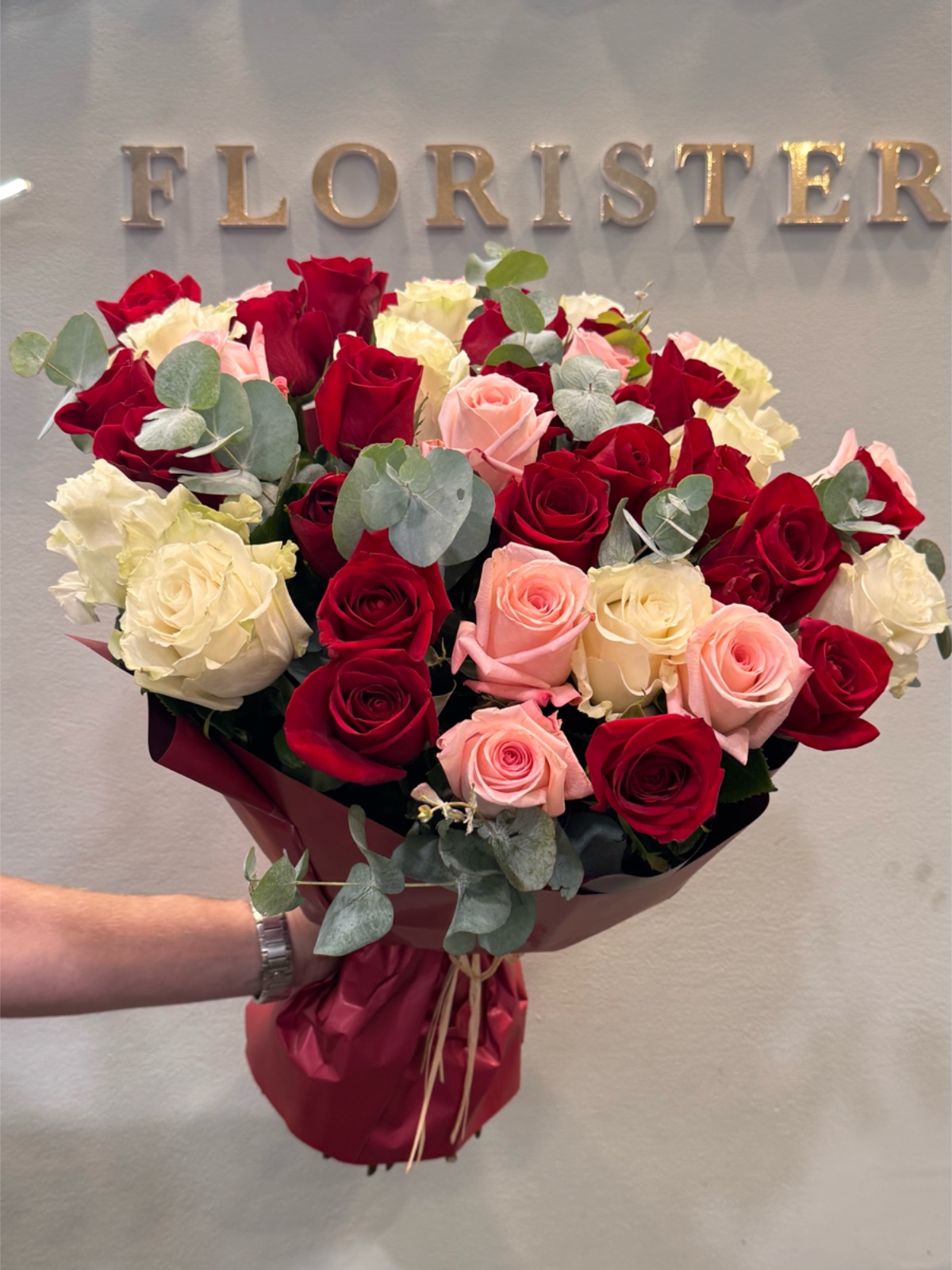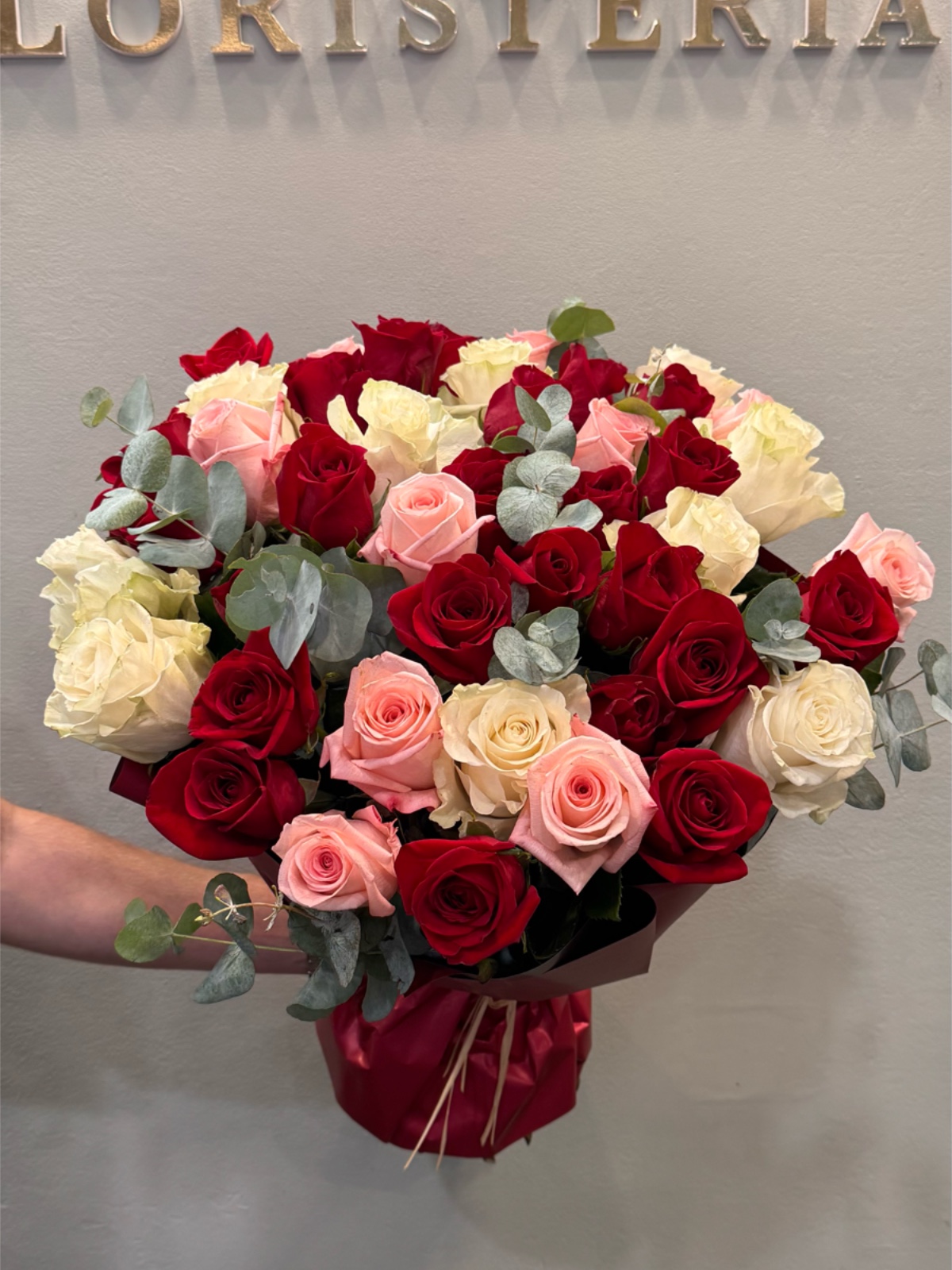 Ramo equilibrado de rosas rojas, blancas y rosadas con eucalipto.