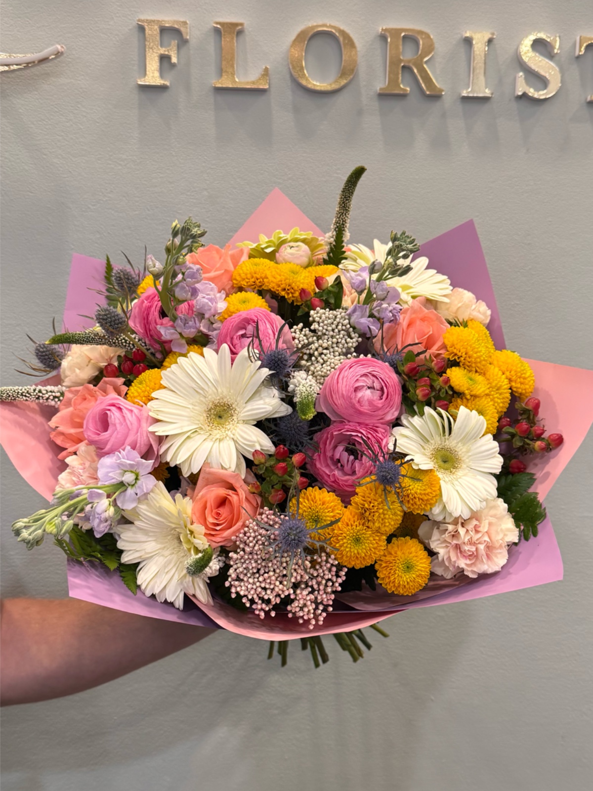 Este ramo combina diferentes flores frescas en una cuidada mezcla de colores vivos y armónicos. Cada composición es dinámica y llena de vida, manteniendo un equilibrio visual atractivo. Es una opción versátil que se adapta a múltiples ocasiones y gustos. Perfecto para regalar alegría, energía y espontaneidad. Un ramo clásico y siempre acertado para sorprender con color.