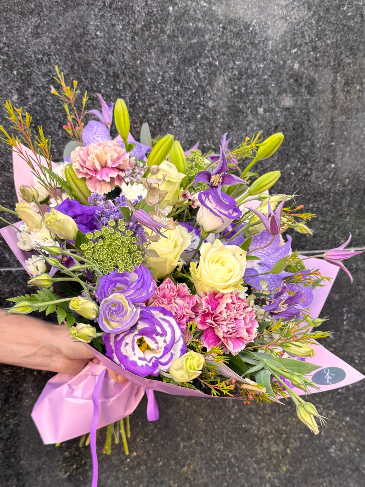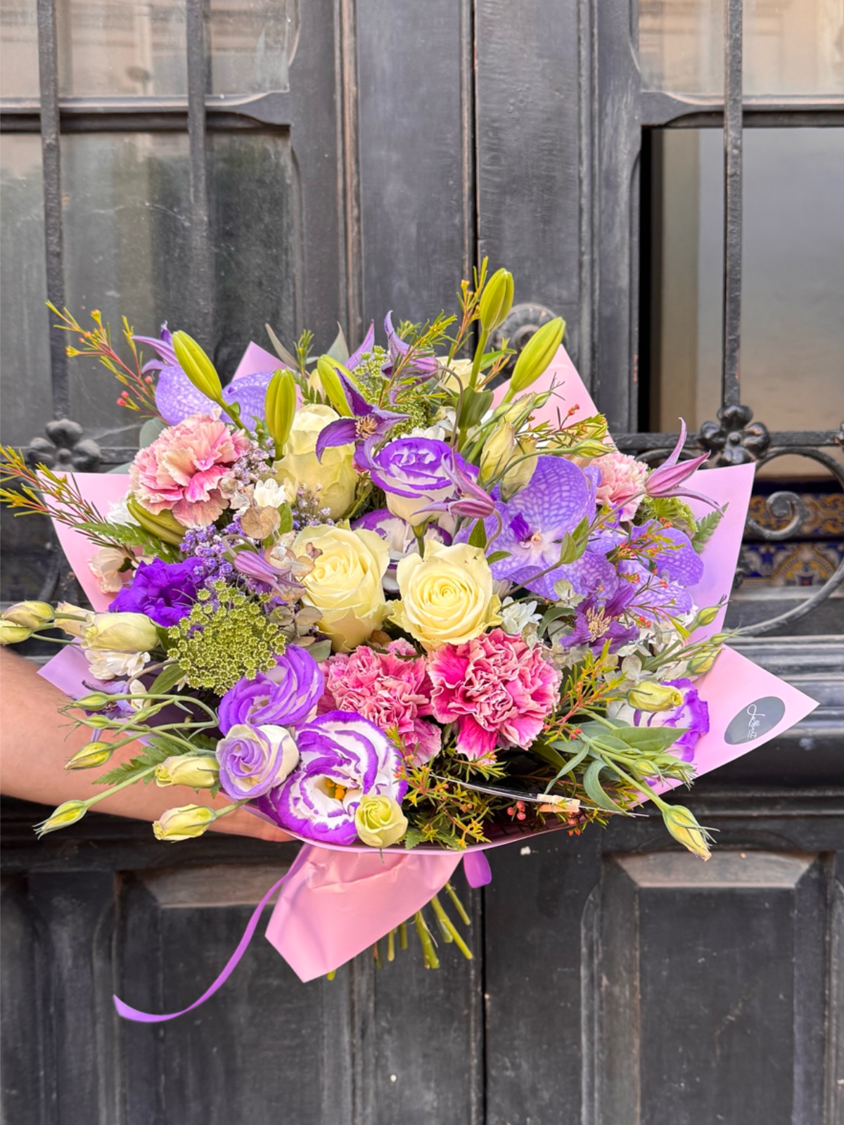 Este ramo combina rosas violetas con flores amarillas de temporada en un diseño premium. Su paleta de colores crea un contraste intenso y elegante. Es ideal para regalos exclusivos y ocasiones especiales. Transmite fuerza, sofisticación y dinamismo. Una composición llamativa y memorable.