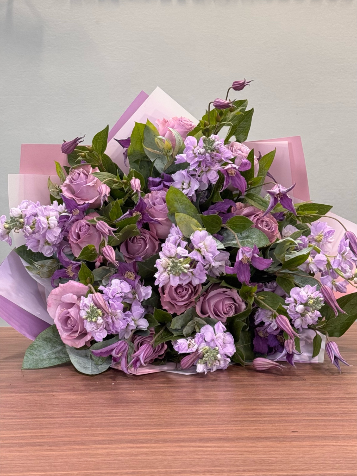 Ramo monocromático en tonos violeta con rosas, matthiola y alstroemerias.