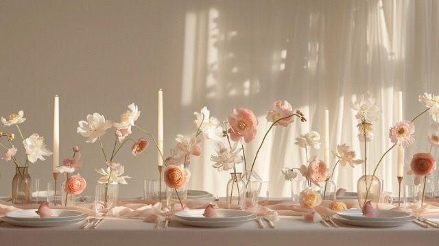 Elegantes composiciones florales para mesas de celebración, que complementan armoniosamente la vajilla y el ambiente.